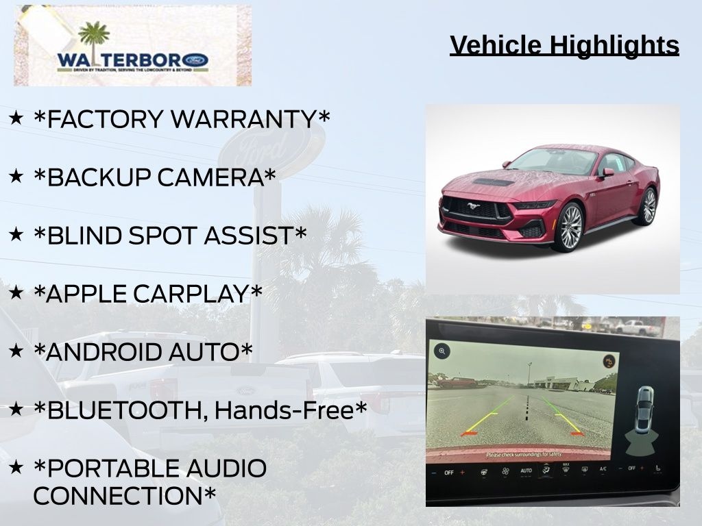 *FACTORY WARRANTY*, *BACKUP CAMERA*, *BLIND SPOT ASSIST*, *APPLE CARPLAY*, *ANDROID AUTO*, *BLUETOOTH, Hands-Free*, *PORTABLE AUDIO CONNECTION*, Mustang GT Premium w/ Active Valve Exhaust, 2D Coupe, 5.0L V8 Ti-VCT, RWD, Molten Magenta Metallic Tri-Coat, 20" Wheels, 9 Speakers, ABS brakes, Active Anti-Theft System, Air Conditioning, Alloy wheels, AM/FM radio: SiriusXM with 360L, Auto High-beam Headlights, Automatic temperature control, Climate Controlled Heated/Cooled Front Seats, Compass, Connected Navigation, Delay-off headlights, Driver Seat & Mirrors Memory, Electronic Stability Control, Equipment Group 401A High Package, Exterior Parking Camera Rear, Ford Co-Pilot360 Assist+, Front dual zone A/C, Fully automatic headlights, HD Radio, Heated door mirrors, Heated front seats, Illuminated Door-Sill Scuff Plates, Illuminated entry, Integrated Turn Signals, Leather-Trimmed Bucket Seats, Leather-Trimmed Bucket Seats w/Color Accents, Locking Center Console, Low tire pressure warning, Power driver seat, Pre-Collision Assist w/Automatic Emergency Braking, Rear Parking Sensors, Remote keyless entry, Security Package, SiriusXM w/360L, Steering wheel mounted audio controls, Traction control, Ventilated front seats, Wheels: 20" x 9" Premium-Painted Aluminum.